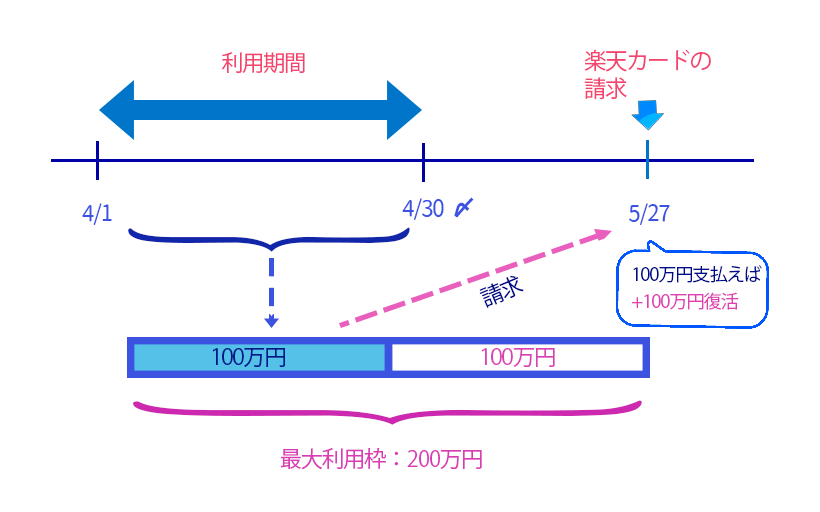 5月27日の支払いを終えるまでの27日間の間、枠は回復しないのです。