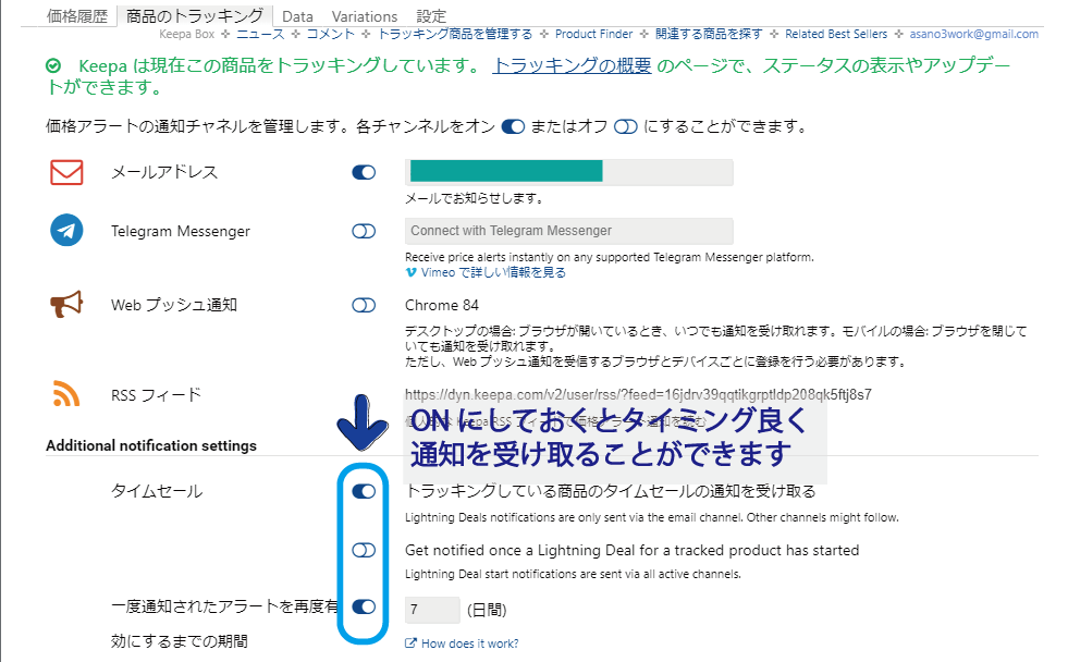 Web版Keepaの[トラッキング]から[トラッキングの概要] をクリックすると確認・変更できます