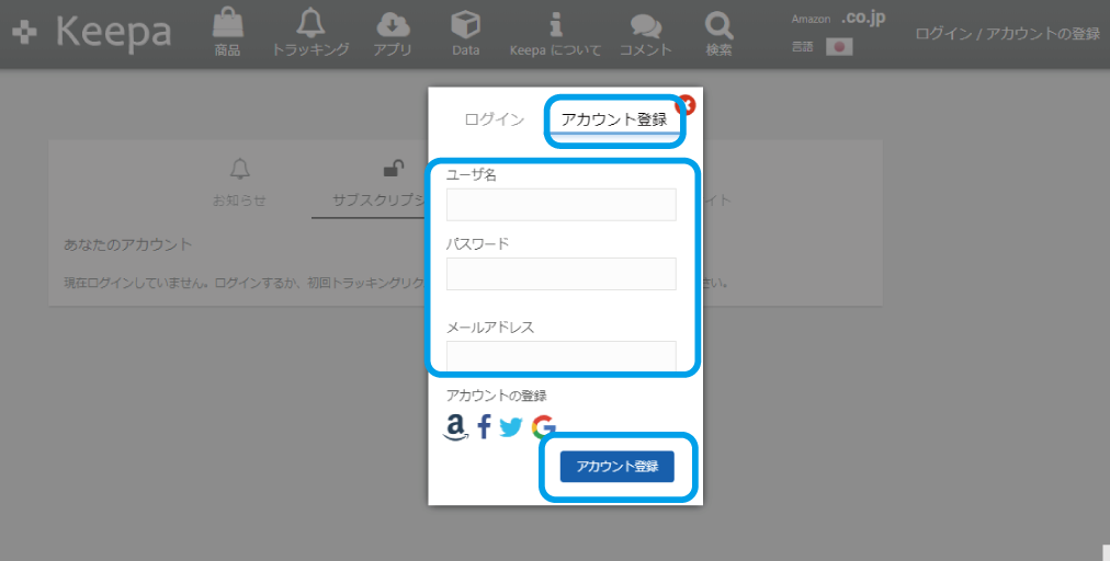 AmazonアカウントやGoogleアカウントを利用して登録することも可能です
