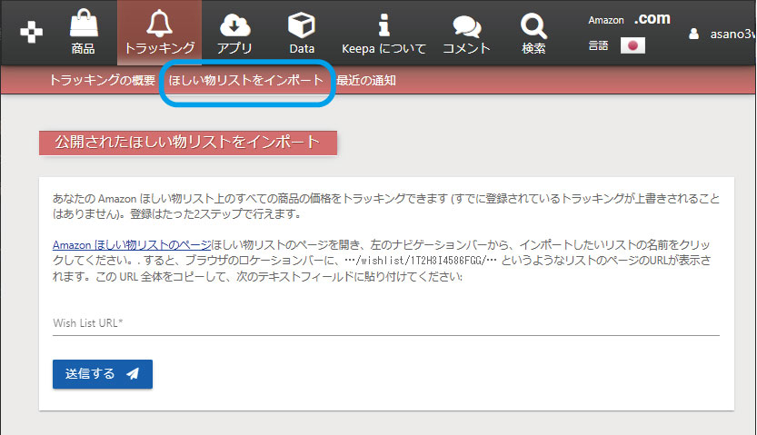 Keepaトップ画面の[トラッキング]⇒[欲しいものリストをインポート]で