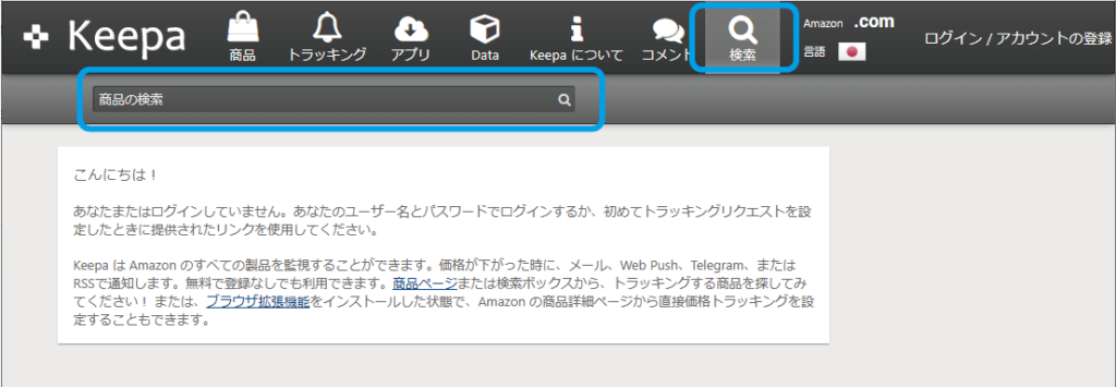 KeepaのWEBページ トップ画面が表示されます